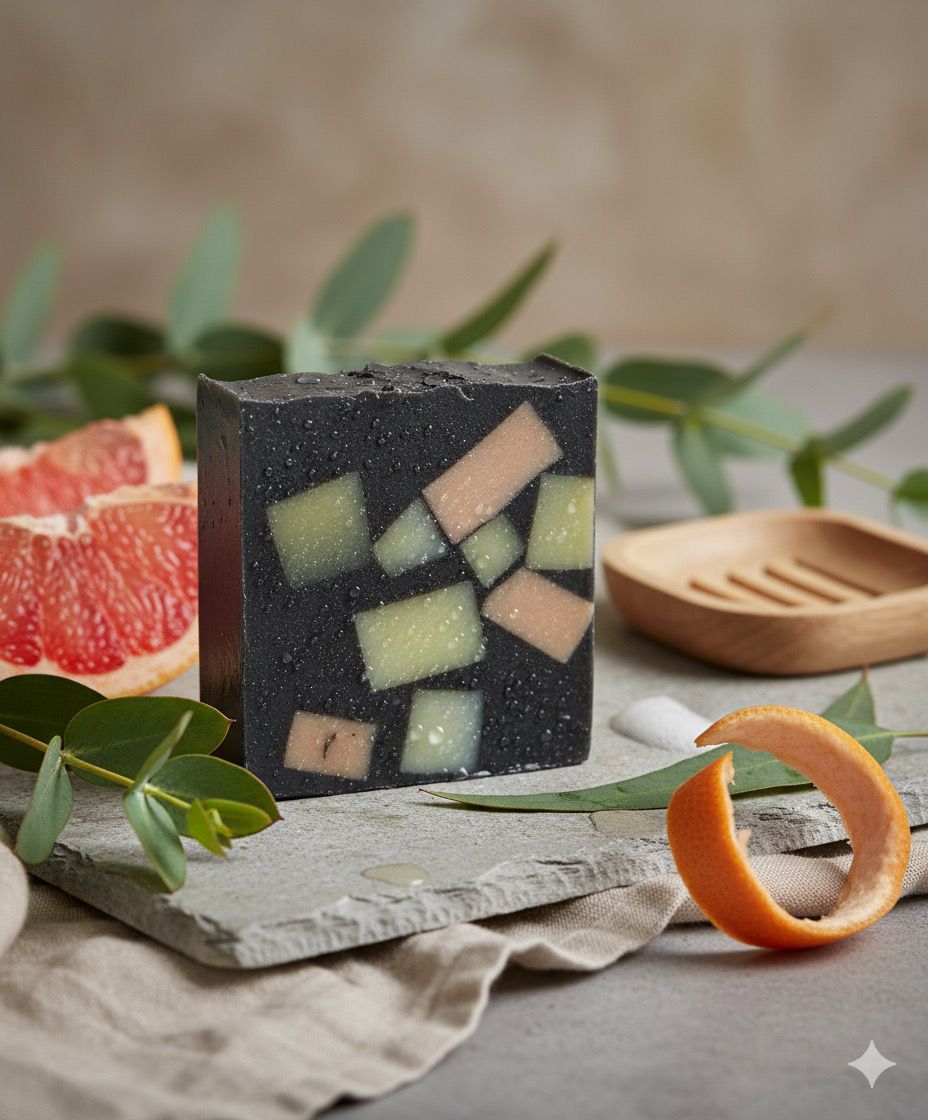 A striking artisan bar with a granite-like charcoal base and colorful mosaic soap pieces. Infused with refreshing eucalyptus and uplifting grapefruit essential oils, this soap delivers a fresh, invigorating cleanse while activated charcoal gently detoxifies the skin. Beautiful and functional, each bar is a one-of-a-kind piece of art.