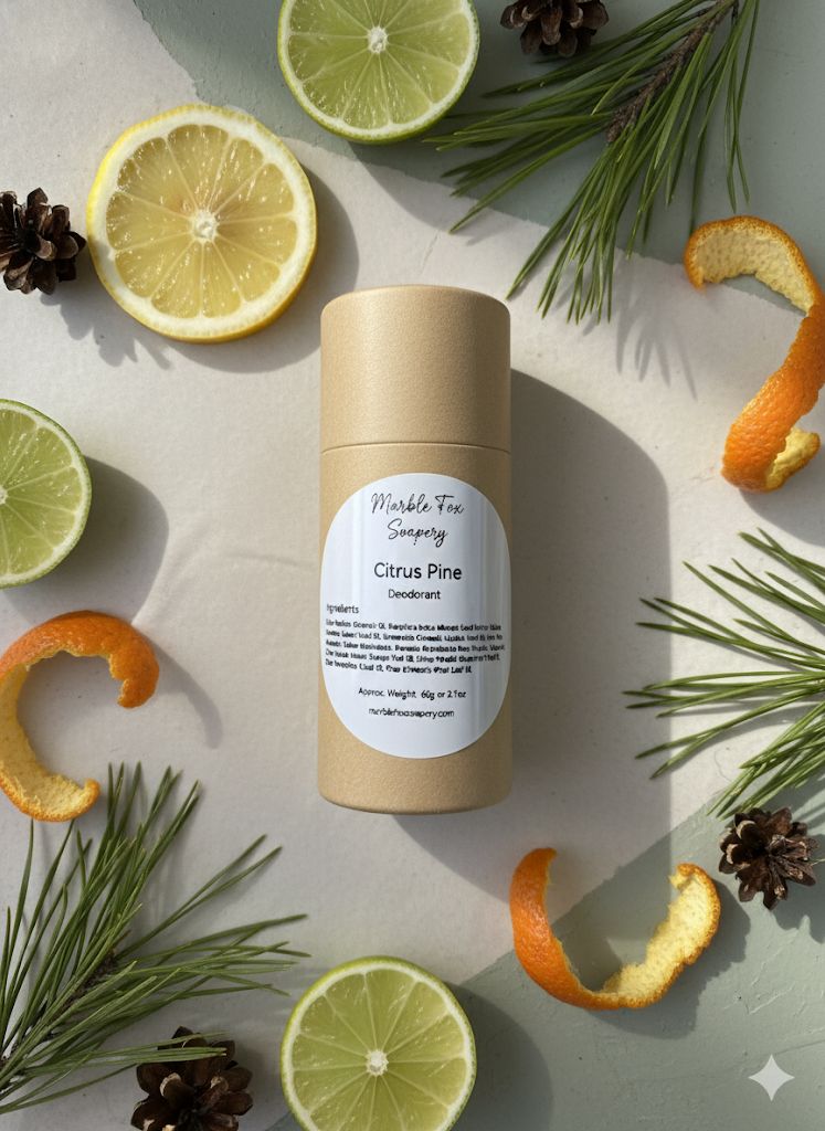 A fresh, clean deodorant inspired by pine forests brightened with a touch of citrus. Made with gentle plant oils and butters, it glides on softly and keeps you feeling comfortable throughout the day. The blend of Sweet Orange, Grapefruit, and Pine Needle essential oils gives it a lively scent that feels like breathing in cool morning air among sunlit trees.