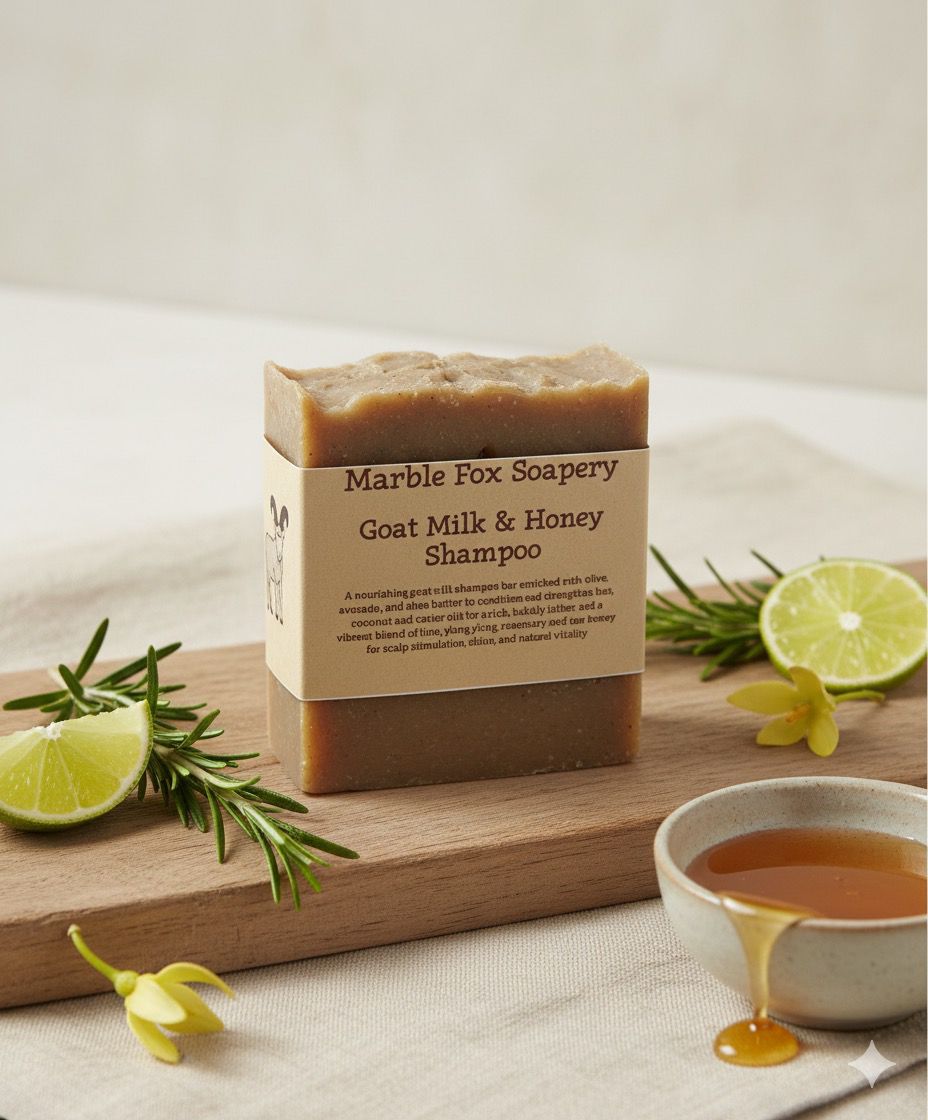 A rich, nourishing shampoo bar made with creamy goat milk and raw honey to gently cleanse while moisturizing both hair and scalp. Formulated with a balanced blend of oils and butters, this bar creates a creamy, bubbly lather that leaves hair soft, shiny, and refreshed. Essential oils of lime, ylang ylang, and rosemary provide a fresh, uplifting aroma while supporting scalp health and natural hair strength.